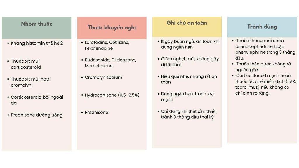 Thuốc xịt mũi budesonide hoặc fluticasone được đánh giá an toàn trong thai kỳ.