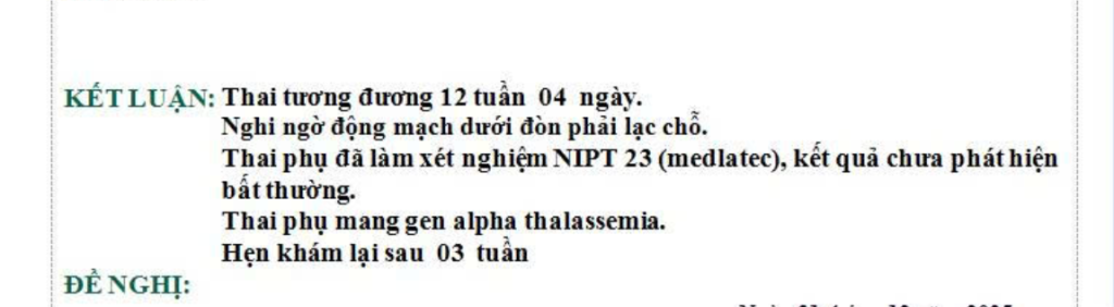 Sau khi siêu âm lại và rà soát hồ sơ, kết luận là động mạch dưới đòn phải lạc chỗ ARSA đơn độc, tim thai hoàn toàn bình thường, NIPT nguy cơ thấp.