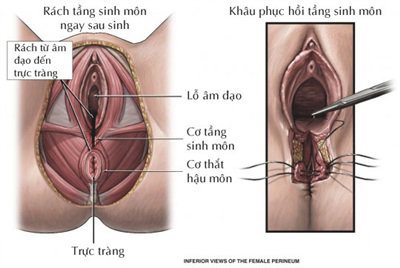 - Khâu từng lớp từ trong ra ngoài: niêm mạc âm đạo → cơ tầng sinh môn → da.
